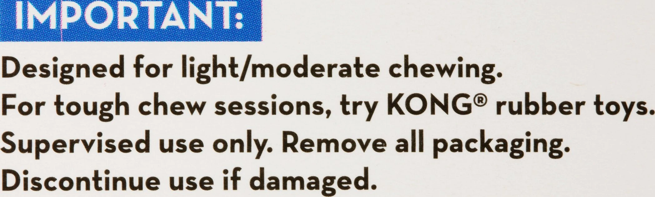 Designed for light/moderate chewing. For tough chew sessions, try KONG rubber toys. Supervised use only. Remove all packaging. Discontinue use if damaged.