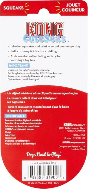 Cuddling with sea creatures has never been this cute. KONG CuteSeas are made of soft corduroy for snuggling. They also contain a squeaker and make a crinkle sound during playtime.