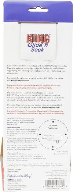 Cats will love the thrill of the chase with the new KONG Glide ‘n Seek toy. Magnetic levitation technology brings the feather toy to life—bouncing, jumping and spinning unpredictably. Peek-a-boo holes keep cats guessing as they hunt and chase. Each KONG Glide ‘n Seek includes two AA batteries and two feather toys.