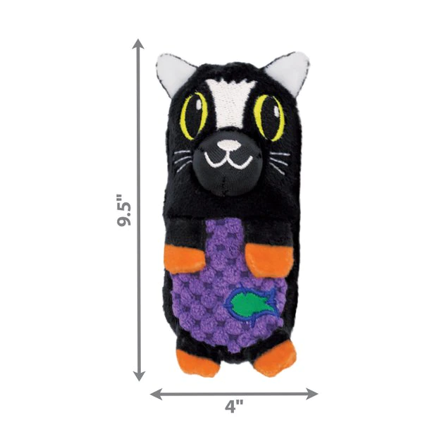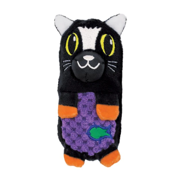 Reward your barking bestie with the the KONG Halloween Huggz Farmz Cat Dog Toy! This purr-fect playtime toy is made with soft, smooth plush material and little stuffing, so there’s plenty of play options and little mess. It’s antimicrobial and mold-resistant, too! It features a bellowing internal squeaker, and a double-layered design for added durability. Your paw-some pup will have a purr-fectly good time with this toy all year long, not just for Howl-o-ween!