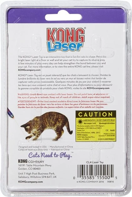 Create the ultimate prey and let your cat unleash her inner huntress with the KONG Laser cat toy. This easy-to-use laser helps facilitate interactive play sessions and provides endless fun for both you and your cat. Simply point the laser at the floor or wall and watch as your cat attempts to capture its elusive prey. This game of cat-and-laser satisfies the curiosity and playfulness of your kitty, and even encourages exercise.