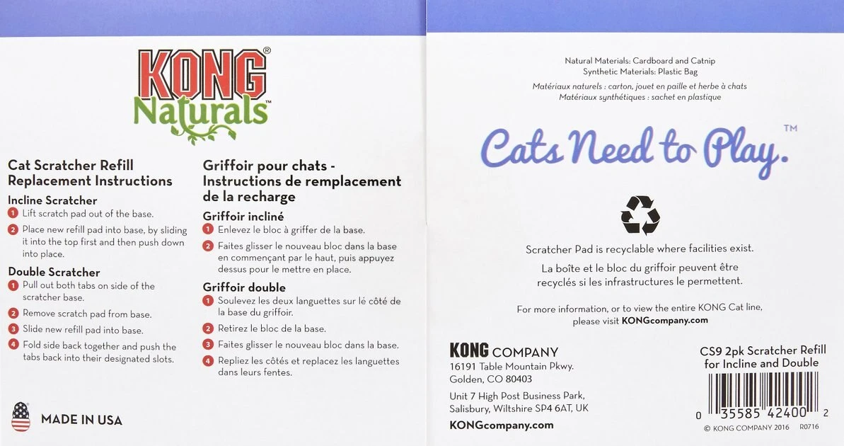 Save your furniture and drapes with the KONG Naturals Cat Scratcher Refill. This 2-pack refill easily replaces your catโs scratcher whenever needed. The easy-to-replace cat scratcher refill is a great way to satisfy your catโs instinct to scratch while encouraging appropriate scratching behavior. Its materialโmade with recyclable and renewable resourcesโis environmentally friendly and comes with Premium North American catnip to entice your cat even more. When itโs completely worn, simply flip it to reveal a new scratching surface.