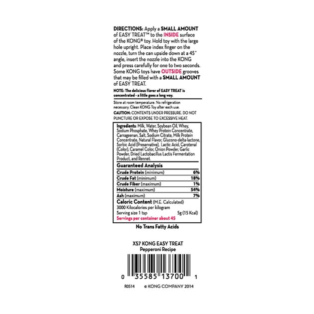 Playtime with your pal is now mess-free, hassle-free, and just a delicious dab away with the irresistible pepperoni flavor of the KONG Stuff’N Easy Treat Pepperoni Recipe. With an easy-to-use, uniquely designed built-in nozzle, simply tilt and press to reward your best pal with a delectable treat anytime, or easily fill any KONG rubber toy for extended playtime. Your dog will love the delicious pepperoni flavor and lip-smacking texture! While he spends hours licking and savoring his favorite treat-stuffed KONG toy, you can feel good about providing a delicious, trans-fat free, highly-digestible reward. Freeze a stuffed KONG toy with treat for a longer-lasting, mentally-stimulating challenge.
