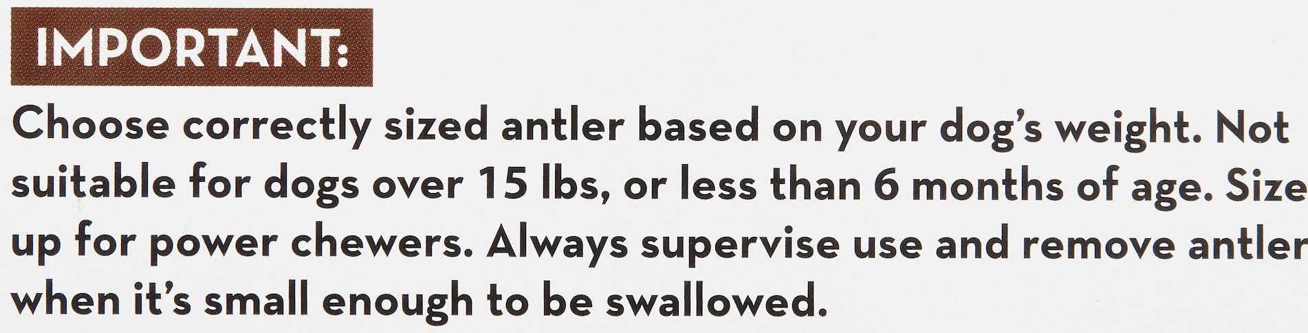 Choose correctly sized antler based on your dog’s weight. Not suitable for dogs 30 lbs, or less than 6 months of age. Size up for power chewers. Always supervise use and remove antler when it’s small enough to be swallowed.