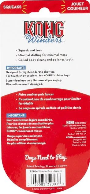 KONG Winders will have the whole family wound up in the fun. Designed for interactive play, dogs love to toss, fetch and tug these exciting toys. The squeaker and tails help to entice play and the coiled body cleans and polishes teeth.